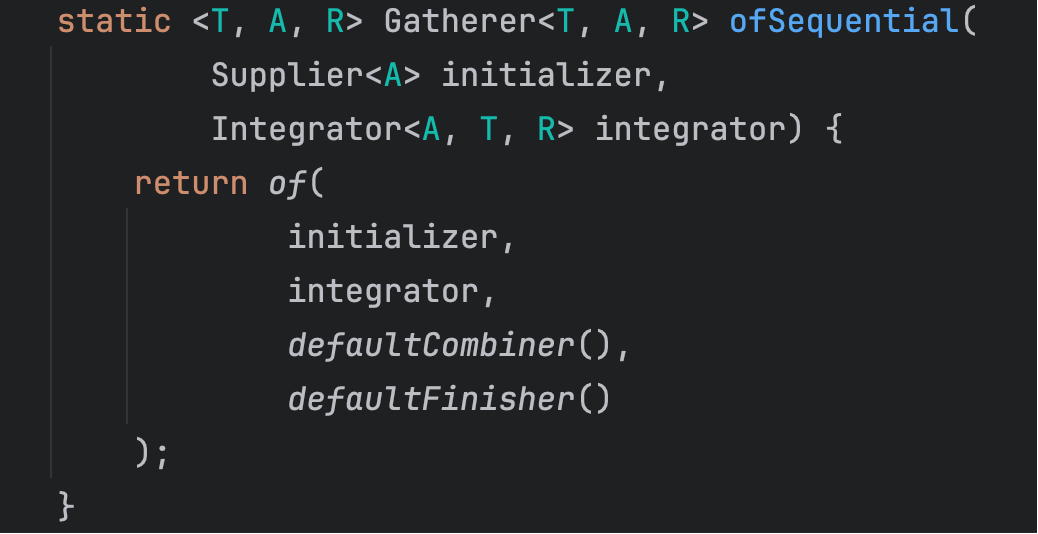 除了内置的 Gatherers 外,还可以自定义 Gatherer,举一个最简单的例子 —— 给每个元素添加前缀。先自定义一个 Gatherer: