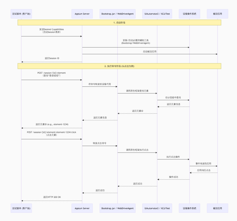 (设备名、应用路径、自动化引擎等)的 HTTP 请求来启动一个会话。Appium 会根据这些配置初始化对应的自动化框架(如 UiAutomator2/XCUITest),并在设备上安装一个特殊的“服务器代理”(Android 上是 bootstrap.jar