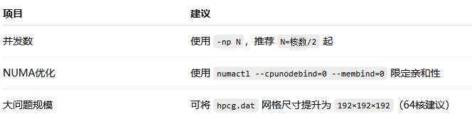 # mpirun --allow-run-as-root --mca pml ob1 -np 64 ./xhpcg]# tail HPCG-Benchmark_3.1_2025-07-08_10-21-09.txtDDOT Timing Variations::Avg DDOT MPI_Allreduce time=2.58093 Final Summary= Final Summary::HPCG result is VALID with a GFLOP/s rating of=16.1137 Final Summary::HPCG 2.4 rating for historical reasons is=16.1678 Final Summary::Reference version of ComputeDotProduct used=Performance results are most likely suboptimal Final Summary::Reference version of ComputeSPMV used=Performance results are most likely suboptimal Final Summary::Reference version of ComputeMG used=Performance results are most likely suboptimal Final Summary::Reference version of ComputeWAXPBY used=Performance results are most likely suboptimal Final Summary::Results are valid but execution time (sec) is=310.259 Final Summary::Official results execution time (sec) must be at least=1800# cat hpcg20250708T100940.txtWARNING: PERFORMING UNPRECONDITIONED ITERATIONS Call [0] Number of Iterations [11] Scaled Residual [1.12102e-13] WARNING: PERFORMING UNPRECONDITIONED ITERATIONS Call [1] Number of Iterations [11] Scaled Residual [1.12102e-13] Call [0] Number of Iterations [2] Scaled Residual [2.79999e-17] Call [1] Number of Iterations [2] Scaled Residual [2.79999e-17] Departure from symmetry (scaled) for SpMV abs(x'*A*y - y'*A*x) = 7.31869e-10 Departure from symmetry (scaled) for MG abs(x'*Minv*y - y'*Minv*x) = 5.92074e-11 SpMV call [0] Residual [0] SpMV call [1] Residual [0] Call [0] Scaled Residual [0.00454823] Call [1] Scaled Residual [0.00454823]