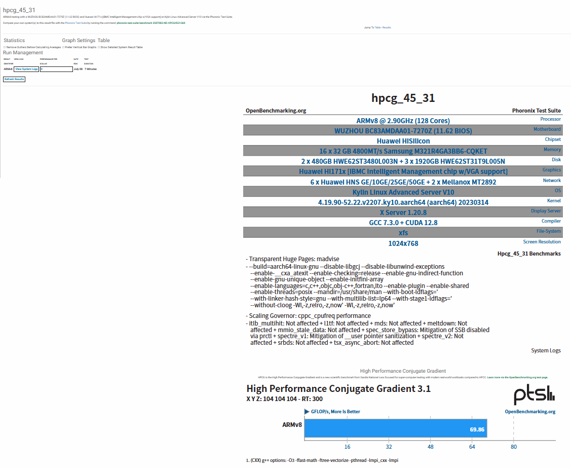 # phoronix-test-suite benchmark hpcg Evaluating External Test Dependencies ....................................................................................................................... Phoronix Test Suite v10.8.4 Installed: pts/hpcg-1.3.0 High Performance Conjugate Gradient 3.1: pts/hpcg-1.3.0 Processor Test Configuration 1: 104 104 104 2: 144 144 144 3: 160 160 160 4: 192 192 192 5: Test All Options ** Multiple items can be selected, delimit by a comma. ** X Y Z: 1 1: 300 [Shorter run-time] 2: 1800 [Official run-time] 3: Test All Options ** Multiple items can be selected, delimit by a comma. ** RT: 1 System Information PROCESSOR: ARMv8 @ 2.90GHz Core Count: 128 Cache Size: 224 MB Scaling Driver: cppc_cpufreq performance GRAPHICS: Huawei Hi171x [iBMC Intelligent Management chip w/VGA support] Screen: 1024x768 MOTHERBOARD: WUZHOU BC83AMDAA01-7270Z BiOS Version: 11.62 Chipset: Huawei HiSilicon Network: 6 x Huawei HNS GE/10GE/25GE/50GE + 2 x Mellanox MT2892 MEMORY: 16 x 32 GB 4800MT/s Samsung M321R4GA3BB6-CQKET DISK: 2 x 480GB HWE62ST3480L003N + 3 x 1920GB HWE62ST31T9L005N File-System: xfs Mount Options: attr2 inode64 noquota relatime rw Disk Scheduler: MQ-DEADLINE Disk Details: Block Size: 4096 OPERATING SYSTEM: Kylin Linux Advanced Server V10 Kernel: 4.19.90-52.22.v2207.ky10.aarch64 (aarch64) 20230314 Display Server: X Server 1.20.8 Compiler: GCC 7.3.0 + CUDA 12.8 Security: itlb_multihit: Not affected + l1tf: Not affected + mds: Not affected + meltdown: Not affected + mmio_stale_data: Not affected + spec_store_bypass: Mitigation of SSB disabled via prctl + spectre_v1: Mitigation of __user pointer sanitization + spectre_v2: Not affected + srbds: Not affected + tsx_async_abort: Not affected Would you like to save these test results (Y/n): y Enter a name for the result file: hpcg_45_31 Enter a unique name to describe this test run / configuration: If desired, enter a new description below to better describe this result set / system configuration under test. Press ENTER to proceed without changes. Current Description: ARMv8 testing with a WUZHOU BC83AMDAA01-7270Z (11.62 BIOS) and Huawei Hi171x [iBMC Intelligent Management chip w/VGA support] on Kylin Linux Advanced Server V10 via the Phoronix Test Suite. New Description: High Performance Conjugate Gradient 3.1: pts/hpcg-1.3.0 [X Y Z: 104 104 104 - RT: 300] Test 1 of 1 Estimated Trial Run Count: 1 Estimated Time To Completion: 38 Minutes [03:16 CDT] Started Run 1 @ 02:39:00 X Y Z: 104 104 104 - RT: 300: 69.8633 Average: 69.8633 GFLOP/s Do you want to view the text results of the testing (Y/n): Y hpcg_45_31 ARMv8 testing with a WUZHOU BC83AMDAA01-7270Z (11.62 BIOS) and Huawei Hi171x [iBMC Intelligent Management chip w/VGA support] on Kylin Linux Advanced Server V10 via the Phoronix Test Suite. ARMv8: Processor: ARMv8 @ 2.90GHz (128 Cores), Motherboard: WUZHOU BC83AMDAA01-7270Z (11.62 BIOS), Chipset: Huawei HiSilicon, Memory: 16 x 32 GB 4800MT/s Samsung M321R4GA3BB6-CQKET, Disk: 2 x 480GB HWE62ST3480L003N + 3 x 1920GB HWE62ST31T9L005N, Graphics: Huawei Hi171x [iBMC Intelligent Management chip w/VGA support], Network: 6 x Huawei HNS GE/10GE/25GE/50GE + 2 x Mellanox MT2892 OS: Kylin Linux Advanced Server V10, Kernel: 4.19.90-52.22.v2207.ky10.aarch64 (aarch64) 20230314, Display Server: X Server 1.20.8, Compiler: GCC 7.3.0 + CUDA 12.8, File-System: xfs, Screen Resolution: 1024x768 High Performance Conjugate Gradient 3.1 X Y Z: 104 104 104 - RT: 300 GFLOP/s > Higher Is Better ARMv8 . 69.86 |================================================================================================================================================== Would you like to upload the results to OpenBenchmarking.org (y/n): y Would you like to attach the system logs (lspci, dmesg, lsusb, etc) to the test result (y/n): y Results Uploaded To: https://openbenchmarking.org/result/2507083-NE-HPCG4531360