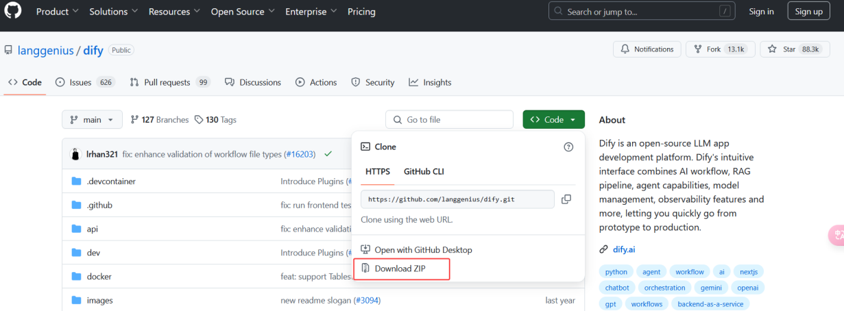 C++kend as Service)和 LLMOps 的理念,内置了构建 LLM 应用所需的关键技术栈,包括对数百个模型的支持、直观的 Prompt编排界面、高质量的 RAG引擎、稳健的 Agent 框架、灵活的流程编排,并同时提供了一套易用的界面和 API。使开发者可以快速搭建生产级的生成式 AI 应用。并且Dify支持本地私有化部署。本篇文章就详细讲解如何在windows