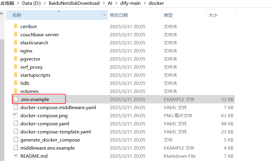 2.1进入dify解压目录下的docker目录,修改.env.example为.env
