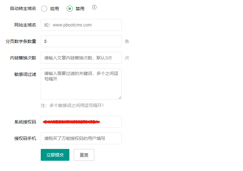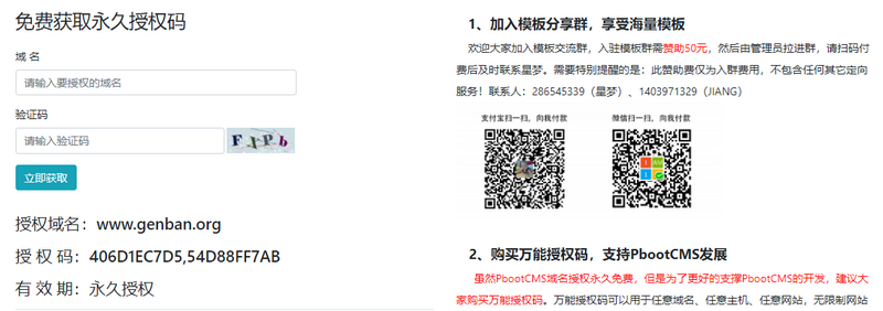 4、这时候我们访问前台页面会提示需要授权(本地测试的话不会有这个提示,可以直接用,迁移到服务器上时候再授权),我们可以到官方网站:https://www.pbootcms.com/freesn/ 这里获取授权,输入您的网址和验证码后会获取到永久授权码(当然如果网站多或者经常更换网址的朋友可以联系右侧官方购买一个万能授权码,那么以后更换网址那些都不需要获取授权)