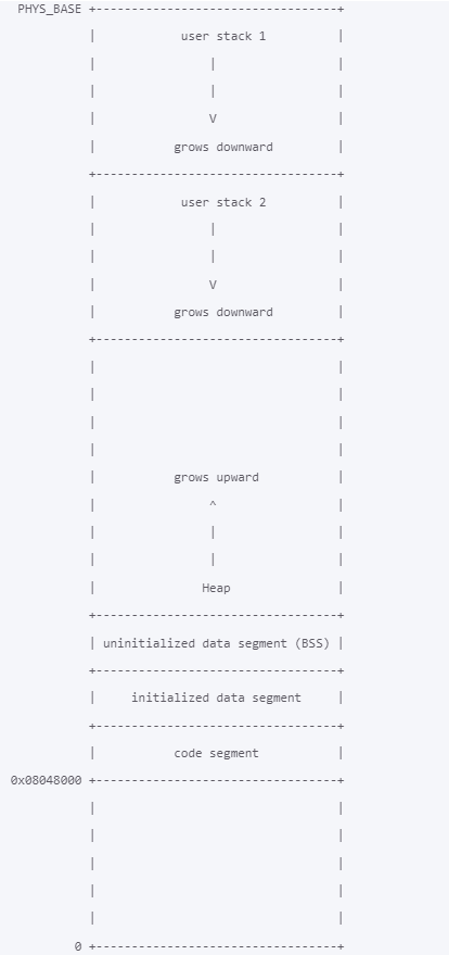 内核空间是所有进程共享的,并且直接映射到物理地址,pa = va – PHYS_BASE. 即虚拟地址PHYS_BASE的物理地址是0.