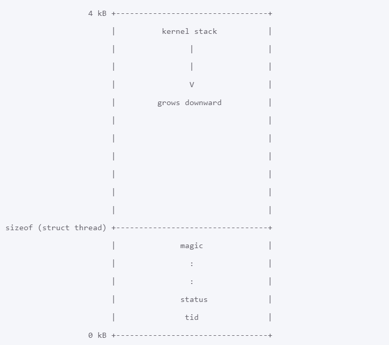 实现线程优先级调度和用户进程的多线程支持。PintOS每个线程在内核中都有一页内存用于存储它的TCB (struct thread)和内核栈,如下图所示。线程切换时会调用thread.c中的schedule(),根据调度算法获取下一个线程的tcb,并调用switch.S中的switch_thread()来进行上下文切换,这是一个汇编函数,在切换完成后当前线程也切换了,也就是说每次线程重新获得CPU都是从switch_thread()中返回,之后再调用thread.c中的thread_switch_tail()进行状态设置、页表切换等收尾操作。