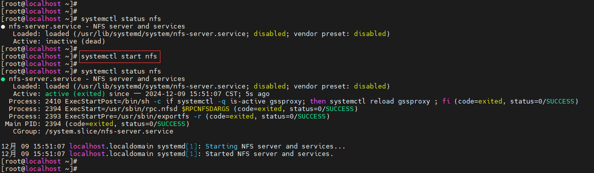 systemctl status nfs | 查看 nfs 服务运行状态 |