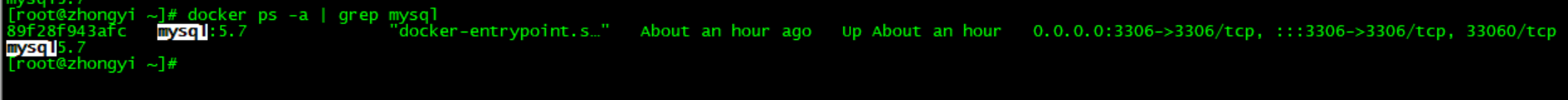 [root@zhongyi ~]# docker run -d -p3306:3306 --name=mysql5.7 -e MYSQL_ROOT_PASSWORD=123456 mysql:5.7 #密码设置为123456
