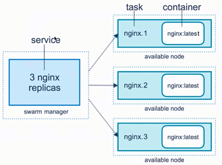 另外一个重要的概念就是service,我们可以在一个manager节点上创建一个服务,但是可以根据这一个服务创建多个容器的任务,这些容器任务运行在不同的节点上。