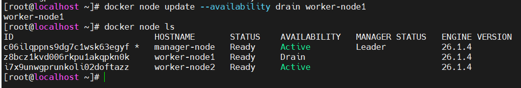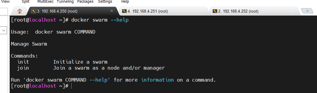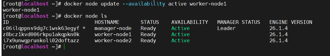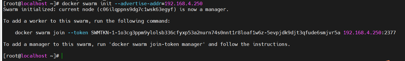 [root@localhost ~]# docker swarm init --advertise-addr=192.168.4.250 Swarm initialized: current node (c06ilqppns9dg7c1wsk63egyf) is now a manager. To add a worker to this swarm, run the following command: docker swarm join --token SWMTKN-1-1o3cg3ppm9ylolsb336cfyxp53a2nurn74s0nnt1r8loaf1w6z-5evpjdk9djt3qfude6smjvr5a 192.168.4.250:2377 To add a manager to this swarm, run 'docker swarm join-token manager' and follow the instructions. [root@localhost ~]#