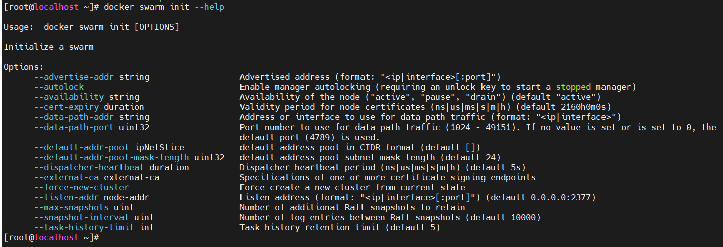 可以看到其中有一个 init 命令,这就是初始化一个Swarm,我们再看看这个 init 的参数: