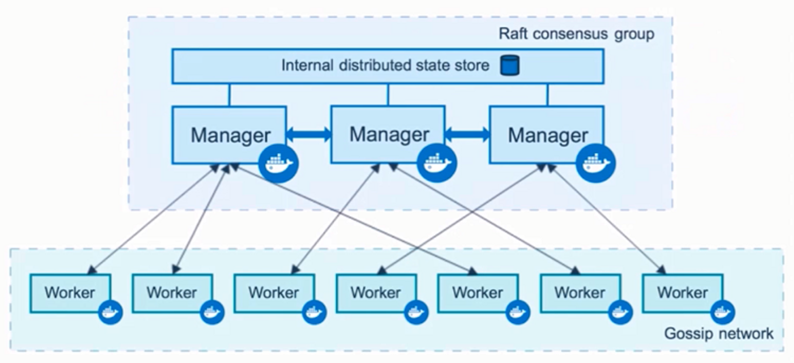 manager节点状态、信息的同步根据Raft consensus group的网络进行通信同步的,而worker之间的通信依靠的是Gossip network做到的。