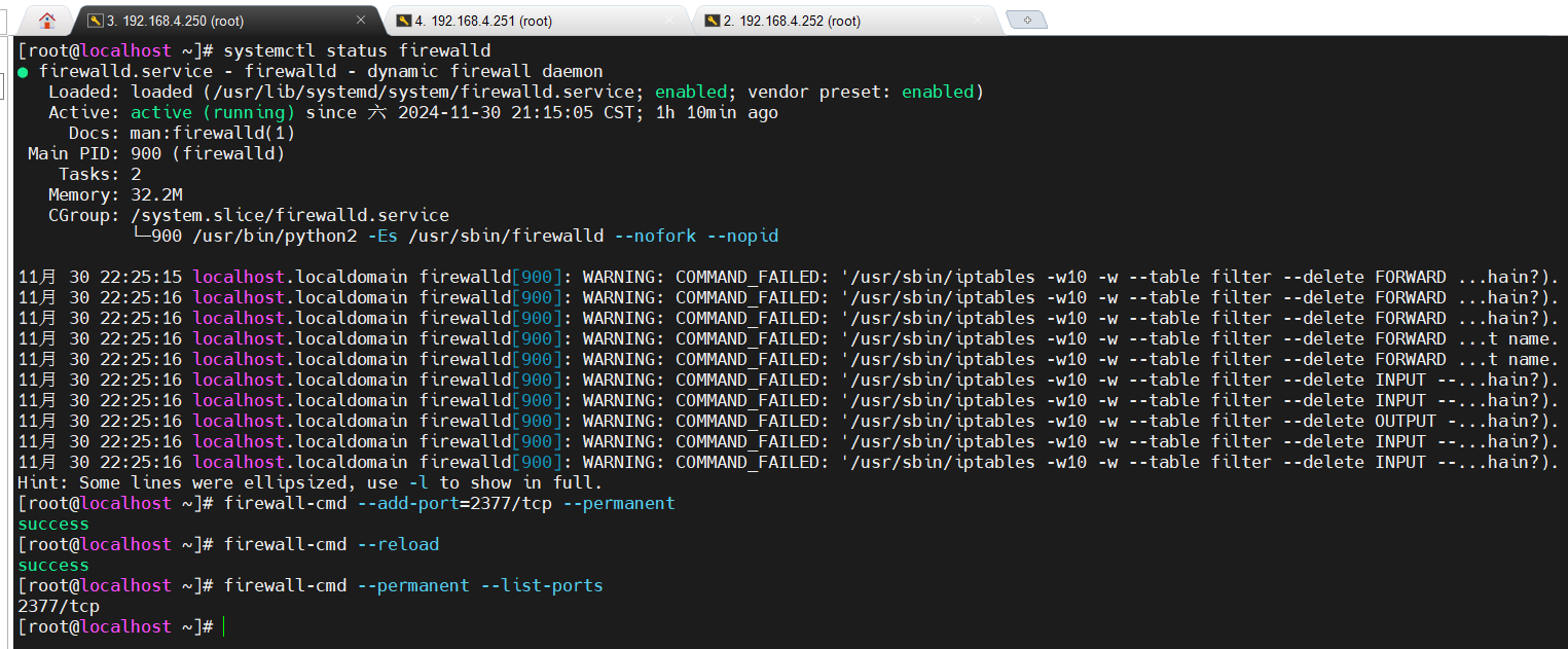 # 查看防火墙状态 systemctl status firewalld # 如果开启了防火墙则永久放行2377端口 firewall-cmd --add-port=2377/tcp --permanent # 重新加载防火墙 firewall-cmd --reload # 查看永久开放的端口 firewall-cmd --permanent --list-ports