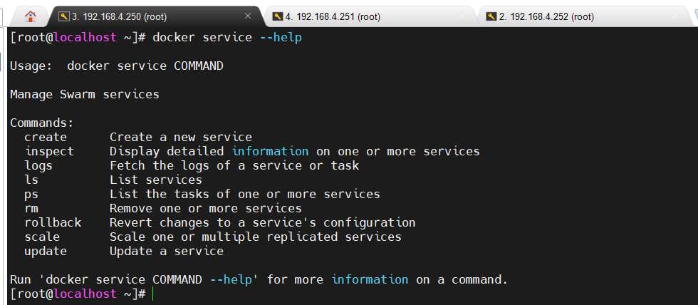 上面我们已经将节点创建好了,现在可以在这些节点上创建服务了,那么就需要看看 docker service 的帮助信息: