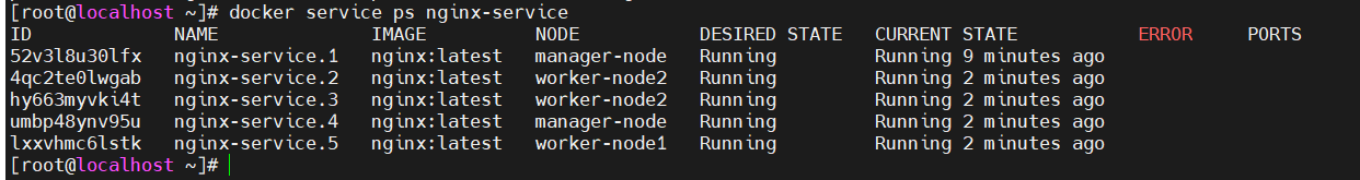 可以看到5个容器在不同的节点上,其中有2个在manager节点,有3个在worker节点上。