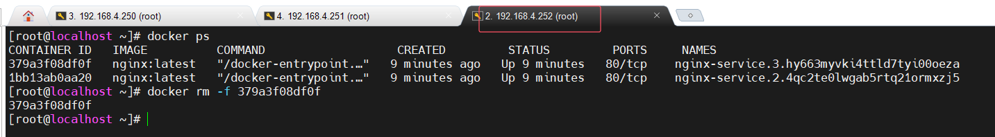scale在swarm中除了水平扩展外,还有一个作用,那就是修复作用,比如将某一个节点中的容器删除掉,那么很快swarm中发觉并进行修复,最终数量还是会和原来的保持一致。