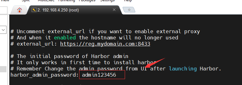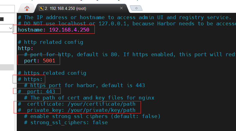 # The IP address or hostname to access admin UI and registry service. # DO NOT use localhost or 127.0.0.1, because Harbor needs to be accessed by external clients. # 修改主机名,如果没有域名就使用本机IP地址 hostname: 192.168.4.250 # 配置启动端口号,默认是80端口,此处我把它改成 5001 # http related config http: # port for http, default is 80. If https enabled, this port will redirect to https port port: 5001 # 如果没有申请证书,需要把 https 这块相关的全部给它注释掉 # https related config # https: # https port for harbor, default is 443 # port: 443 # The path of cert and key files for nginx # certificate: /your/certificate/path # private_key: /your/private/key/path # 启动成功后,admin用户的初始登录密码 harbor_admin_password: admin123456