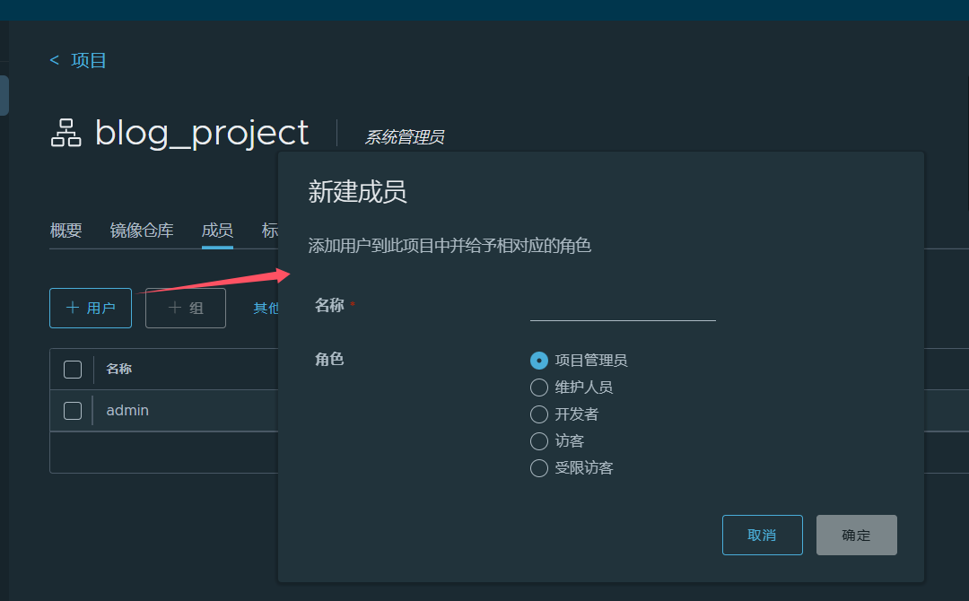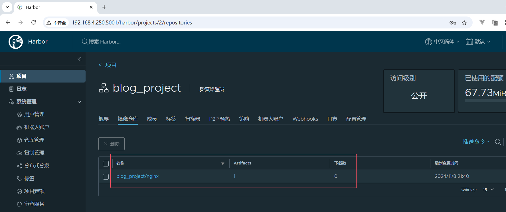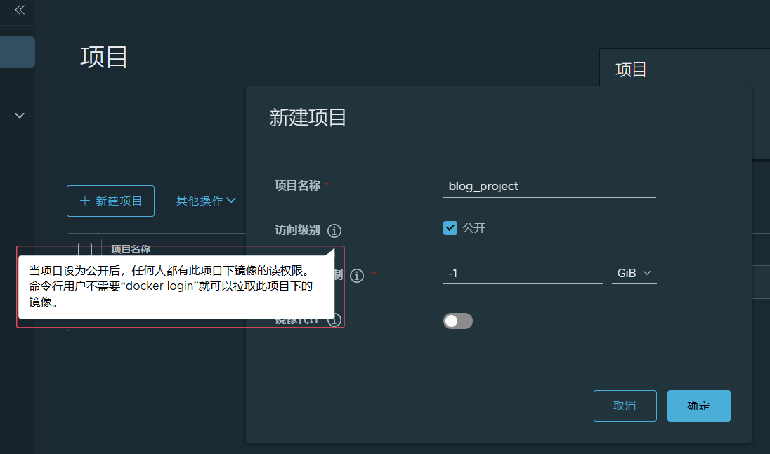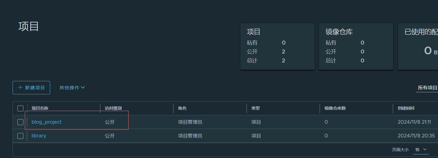 项目管理顾名思义就是用来管理项目的。可以为每一个开发项目创建一个私有项目库,然后把 Docker 镜像存储到指定的项目中,为每个项目实现项目镜像隔离。创建项目的时候,Harbor提供了公开库(public repository)和私有库(private repository)两种类型的镜像存储空间。