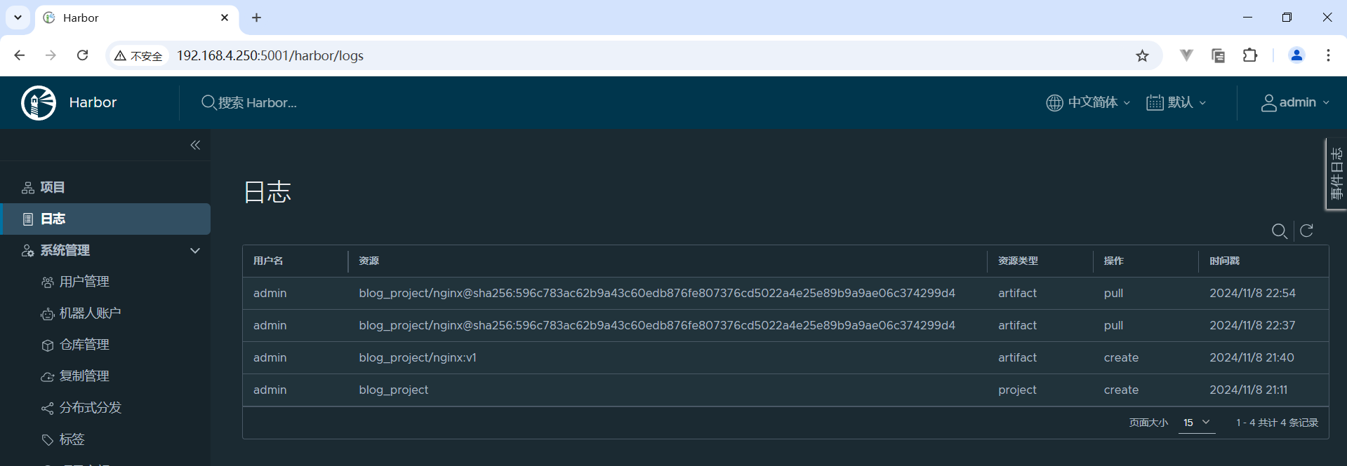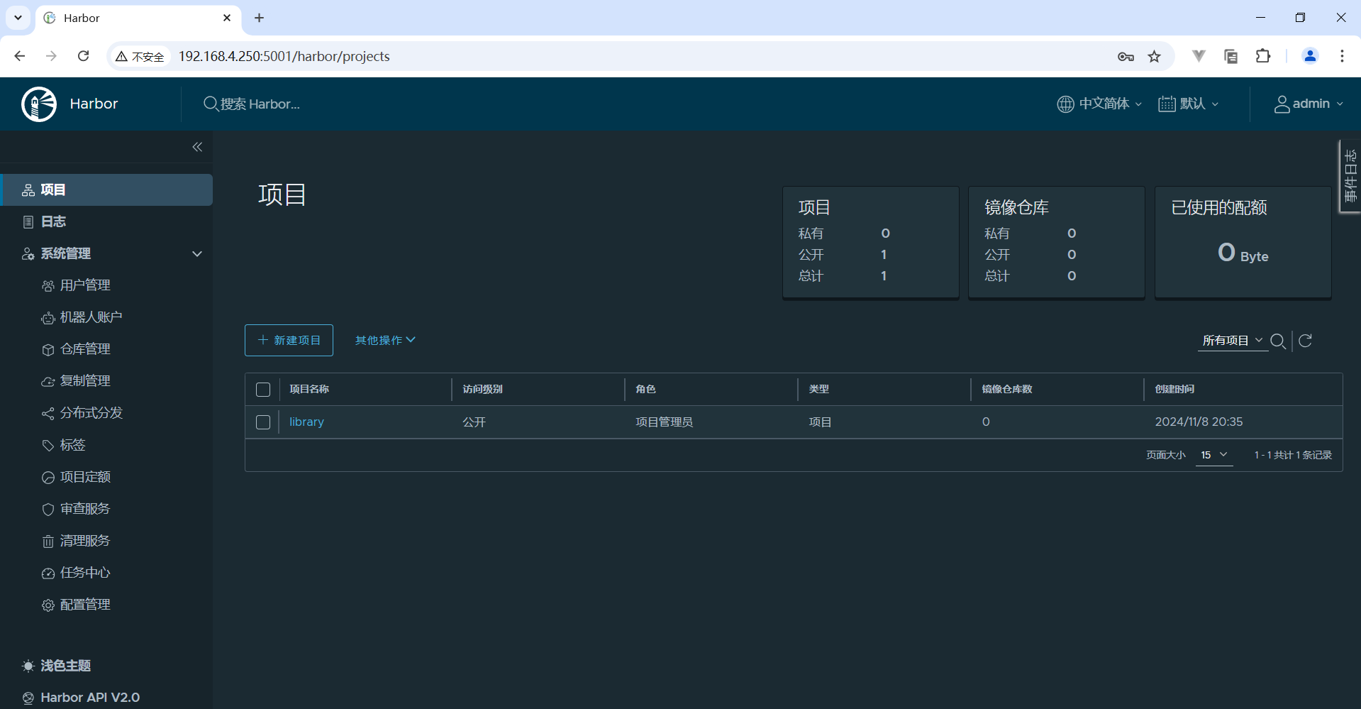 提示安装成功,接下来就可以访问 Harbor 了。通过 IP+端口 访问:http://192.168.4.250:5001