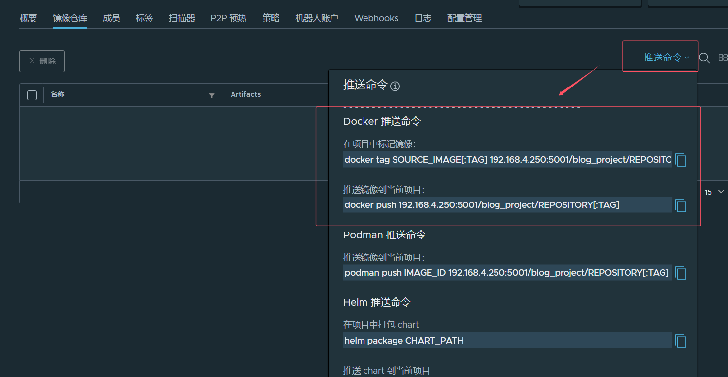 在右上角显示推送命令,可以通过提示命令进行 docker 镜像推送。