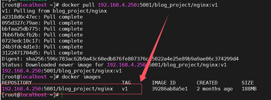通过另一台服务器,使用 docker pull 从私有仓库拉取镜像: