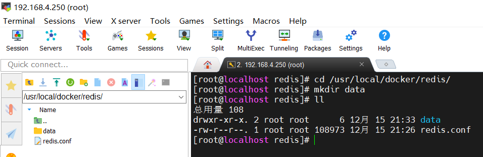 // 进入/usr/local/docker/redis目录 cd /usr/local/docker/redis/ // 创建data目录 mkdir data // 查看文件列表 ll