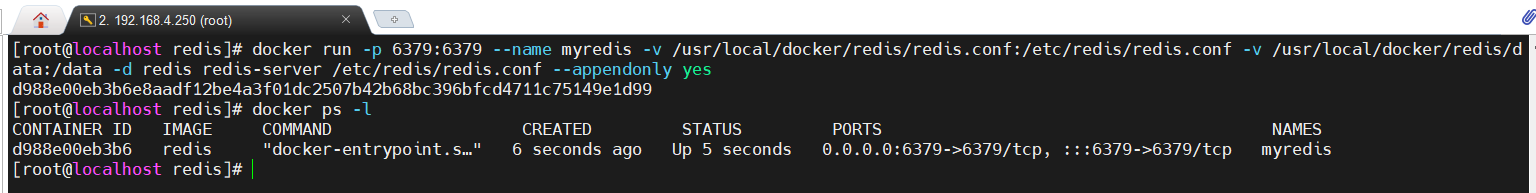 docker run -p 6379:6379 --name myredis -v /usr/local/docker/redis/redis.conf:/etc/redis/redis.conf -v /usr/local/docker/redis/data:/data -d redis redis-server /etc/redis/redis.conf --appendonly yes