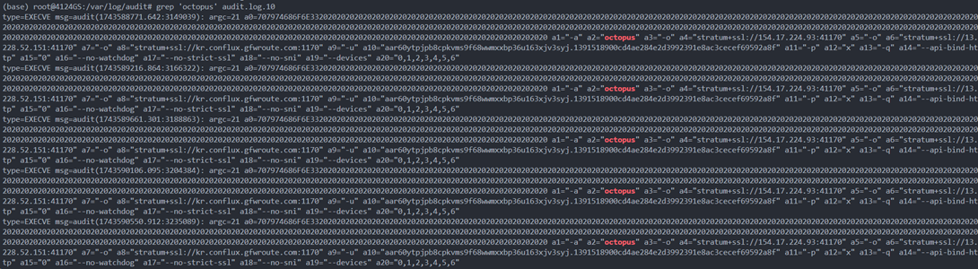 过一阵子,对审计日志进行观察,确实发现有木马相关进程的执行,并且也记录了所有执行的参数: