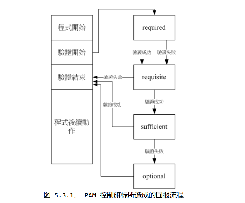 注意:一个配置文件中通常都会存在着多行相同验证类别(如 auth)的规则,以及包含另外一个 PAM 配置文件规则(如 common-auth 或 system-auth)的情况,而且各规则之间的配置顺序可能并不是严格按照 auth -> acconut -> session -> password