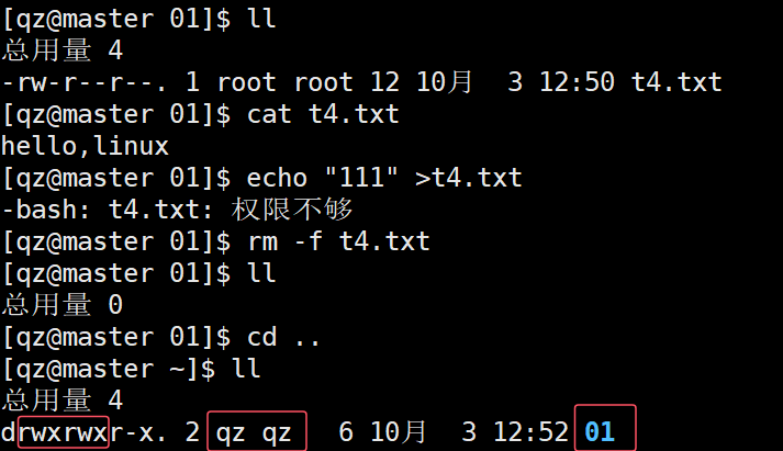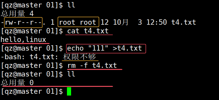 我们可以看到,这个文件的拥有者和所属组均是root,而用户qz属于others,只有读权限,我们只能读取文件而不能修改文件内容,但是我们却可以将该文件给删掉,这是为什么呢?