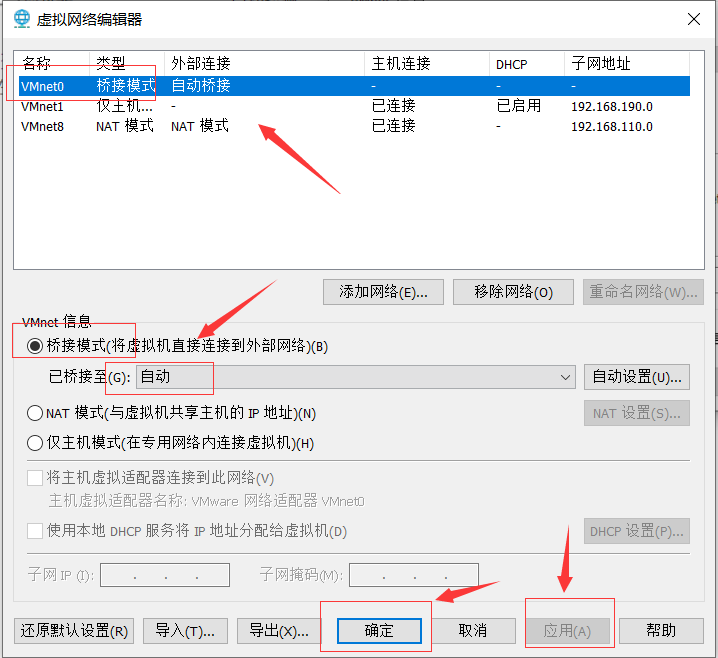 此处选择VMnet0、桥接模式、自动,然后应用并确定。