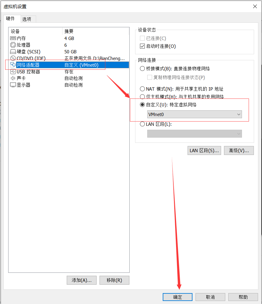 点击【网络适配器】,选择【自定义(U):特定虚拟网络】,选择【VMnet0】,点击确定。