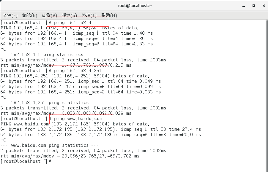 可以看到,网关、本机(虚拟机)地址、百度都能ping的通。