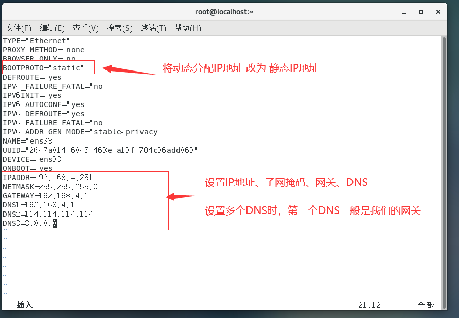 TYPE="Ethernet" PROXY_METHOD="none" BROWSER_ONLY="no" BOOTPROTO="static" DEFROUTE="yes" IPV4_FAILURE_FATAL="no" IPV6INIT="yes" IPV6_AUTOCONF="yes" IPV6_DEFROUTE="yes" IPV6_FAILURE_FATAL="no" IPV6_ADDR_GEN_MODE="stable-privacy" NAME="ens33" UUID="2647a814-6845-463e-a13f-704c36add863" DEVICE="ens33" ONBOOT="yes" IPADDR=192.168.4.251 NETMASK=255.255.255.0 GATEWAY=192.168.4.1 DNS1=192.168.4.1 DNS2=114.114.114.114 DNS3=8.8.8.8