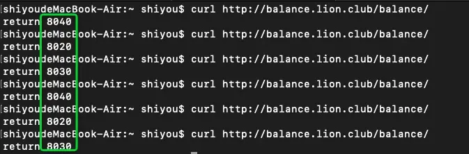 在客户端机器执行 curl http://balance.lion.club/balance/ 命令: