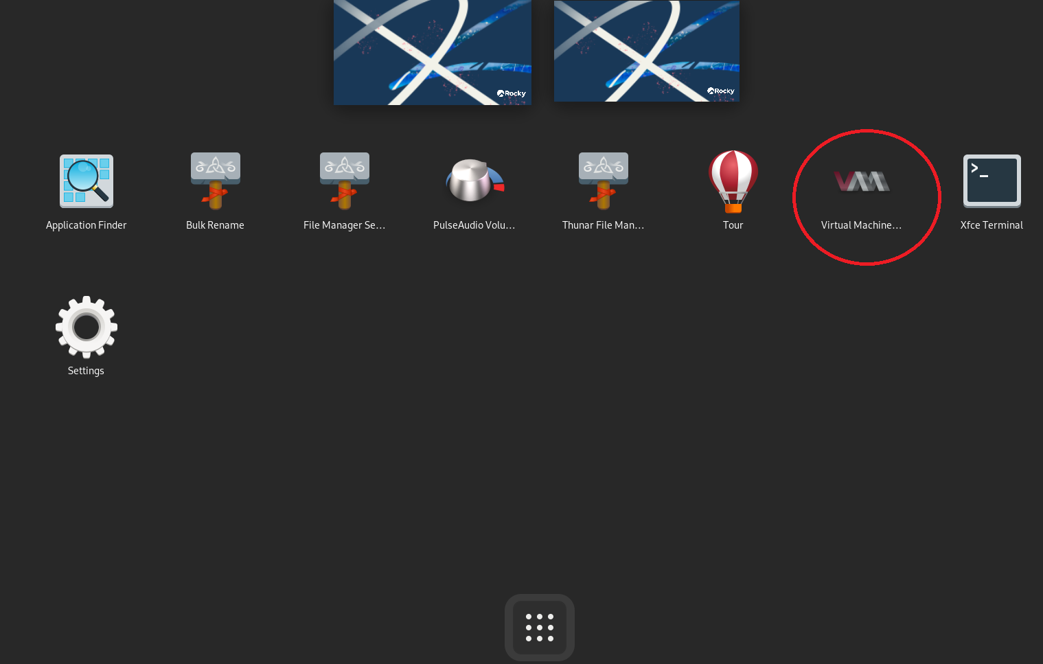 完成上述安装后,可以通过RDP客户端mstsc 登录 RockyLinux主机。可以看到 Virtual Machine Manager(简称virt-manager)程序。后续我们可以通过virt-manager对虚拟机进行管理。