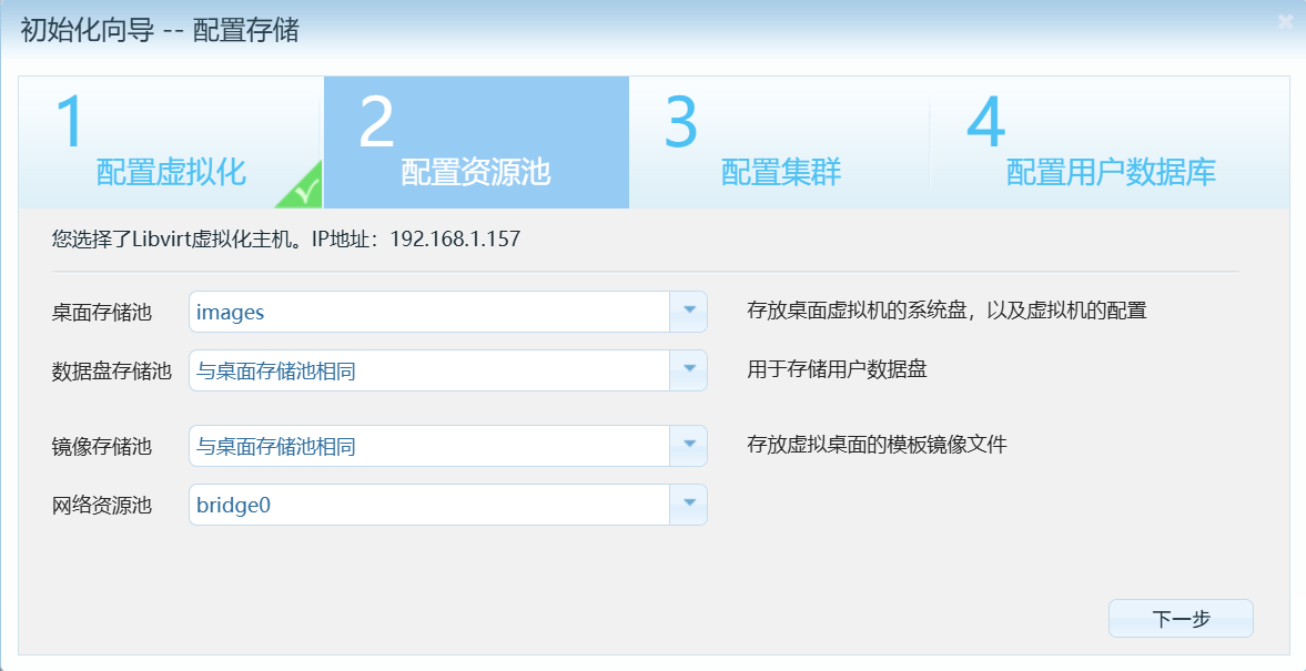 选择存储池、网络池。 镜像存储池、数据盘存储池,默认值是与虚拟机存储池保持一致。