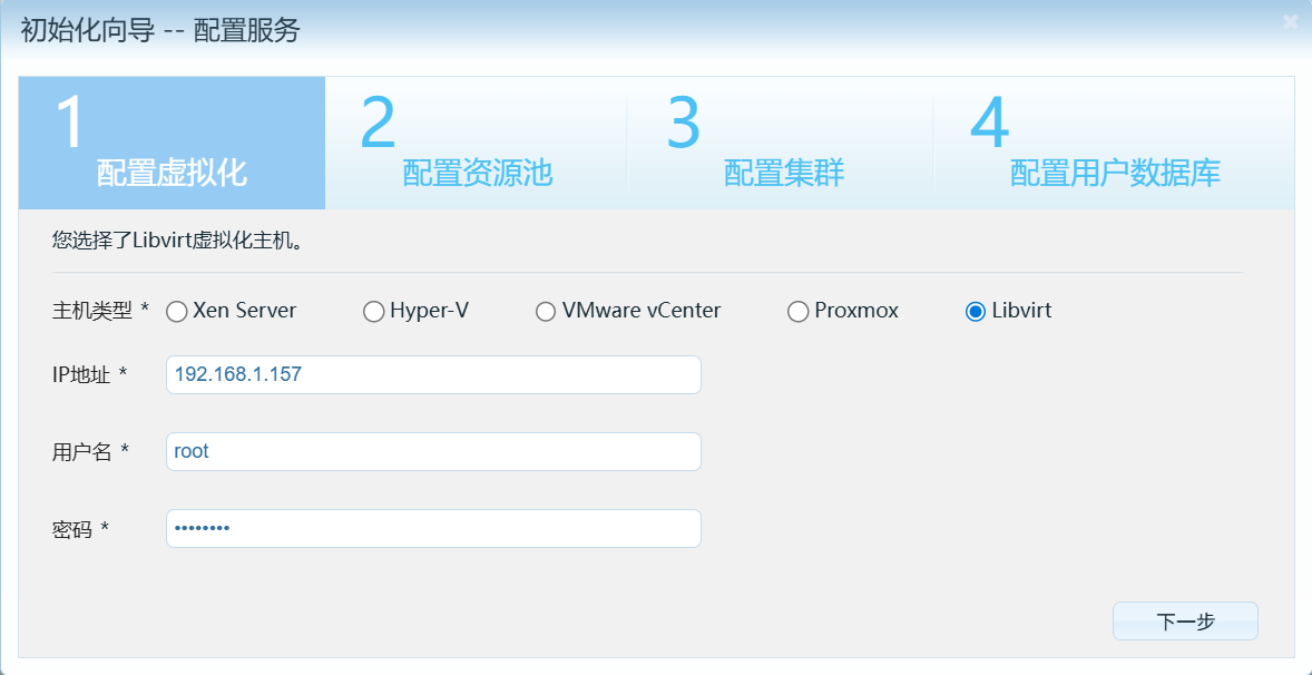 选择主机类型为 LibVirt,输入服务器的IP地址、用户名、密码。