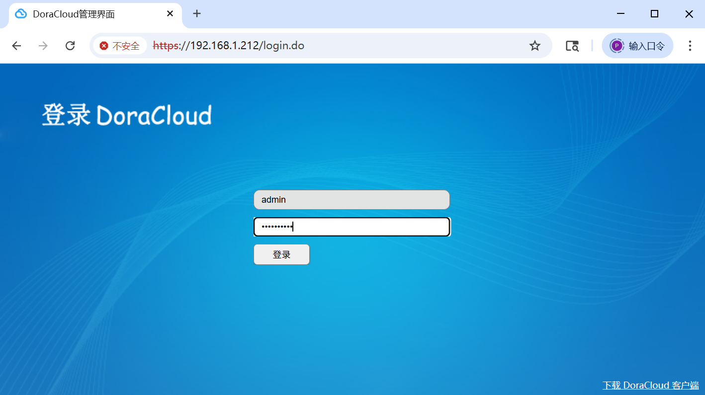 安装完毕后,浏览器打开 DoraCloud管理后台的地址,输入默认账号 admin DoraCloud,即可登录管理后台