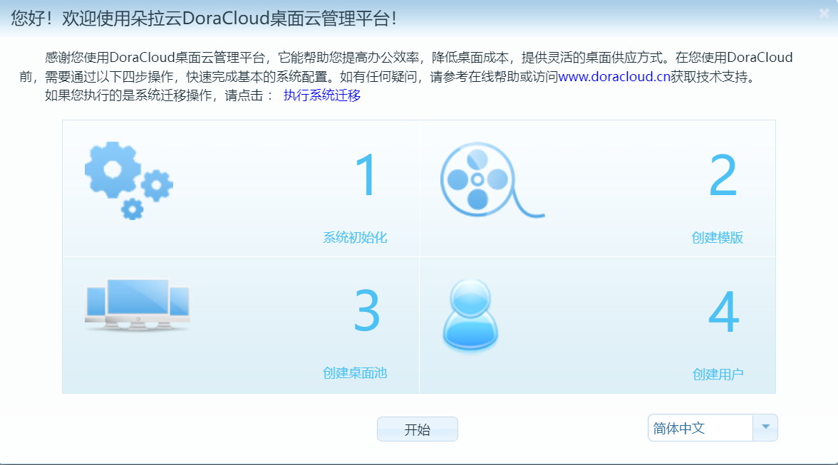 登录后,显示欢迎页面。可以选择系统的语言,然后下一步。