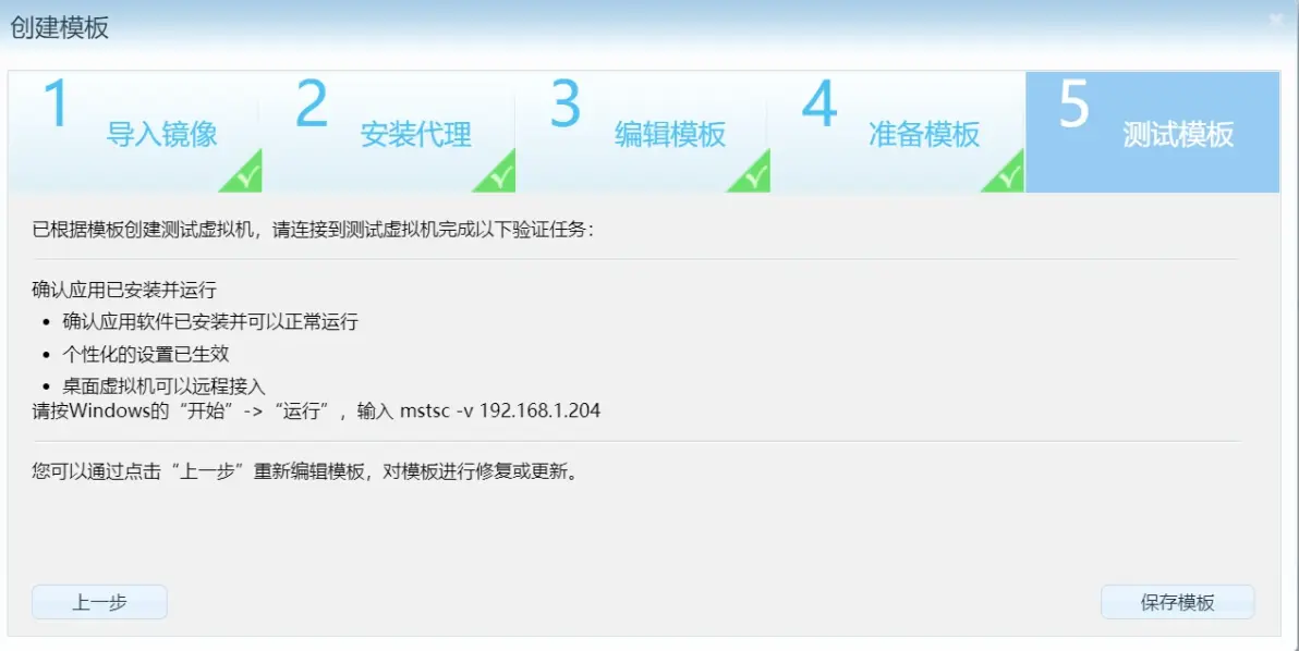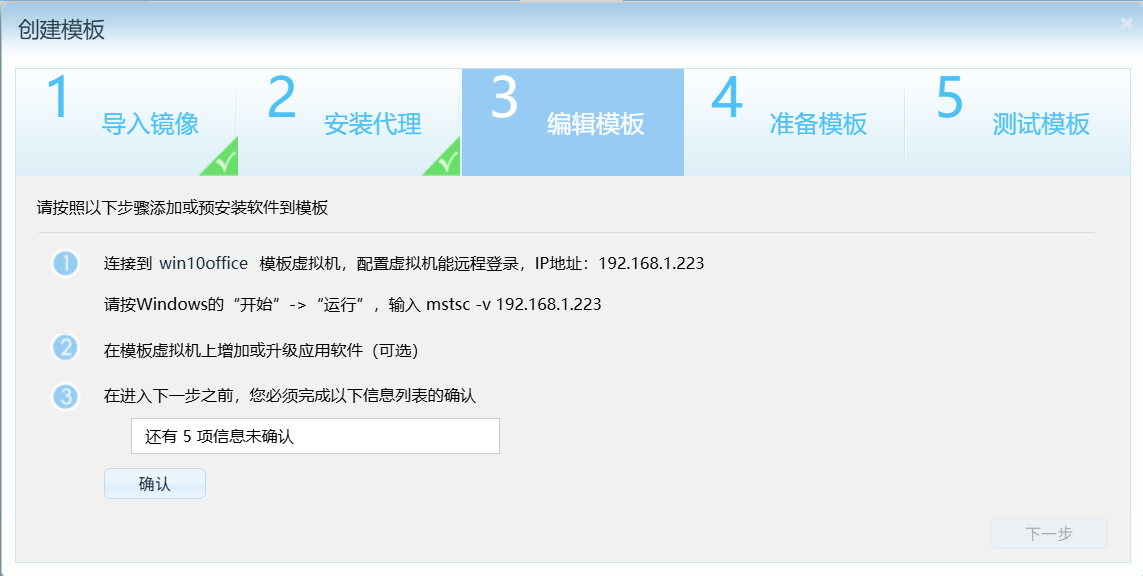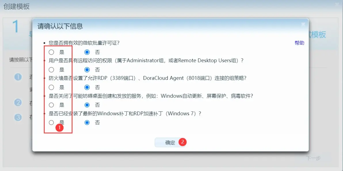 应用程序安装完毕后,我们回到DoraCloud管理后台的模板制作向导,确认如下信息。
