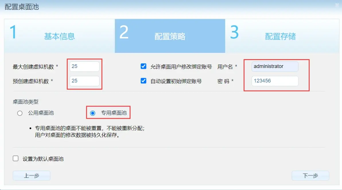 设置桌面池的创建策略。【最大创建】、【预创建】都设置成25。绑定账号设置成 administrator 123456 。 桌面池类型选择为【专用桌面】。
