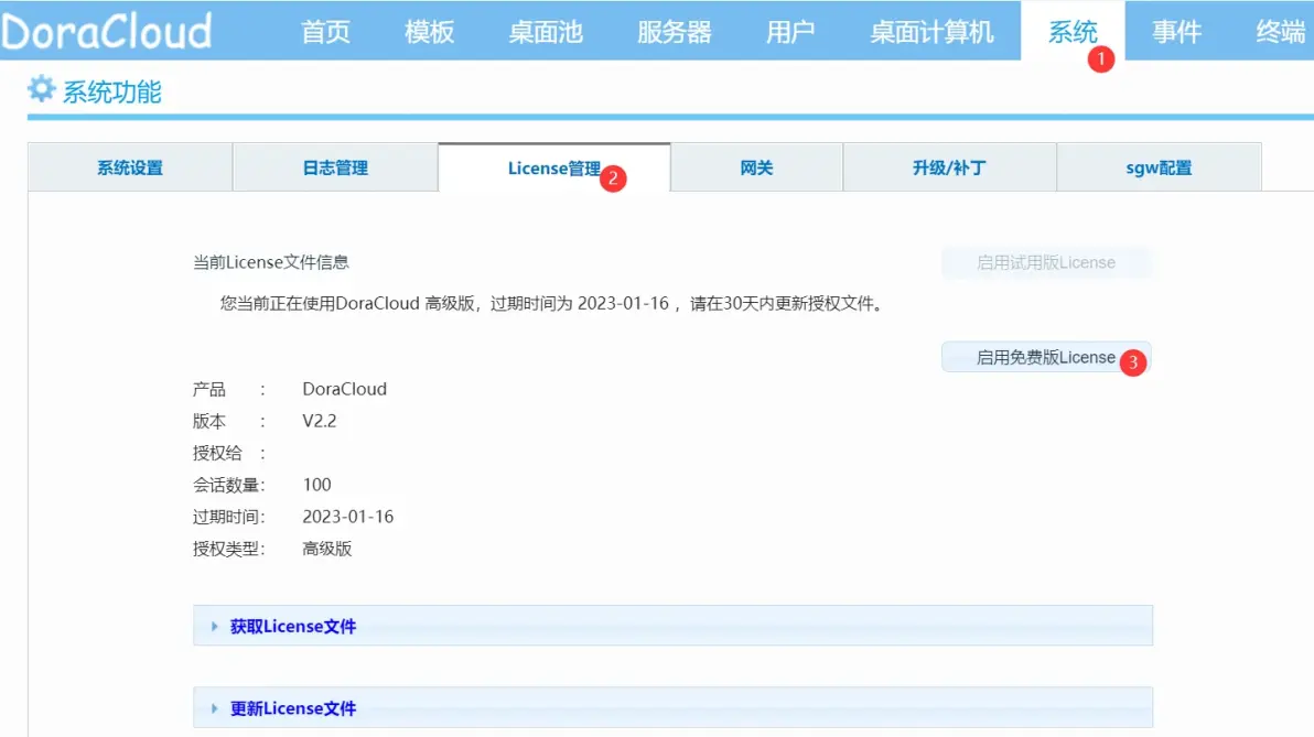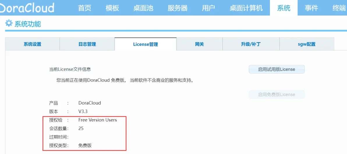 DoraCloud安装后,缺省处于试用状态。如果你希望测试 DoraCloud 功能,可以在试用状态下测试。如果你希望长期免费试用,可以将软件许可切换成免费版。如下图操作。