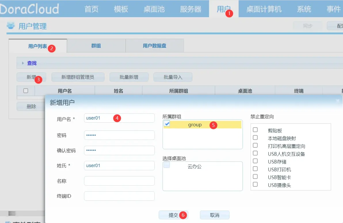 由于 group1 已经签约了桌面池,user01继承了group签约的桌面池。 不需要单独为user01 配置签约的桌面池。 点击提交,完成用户user01的创建。