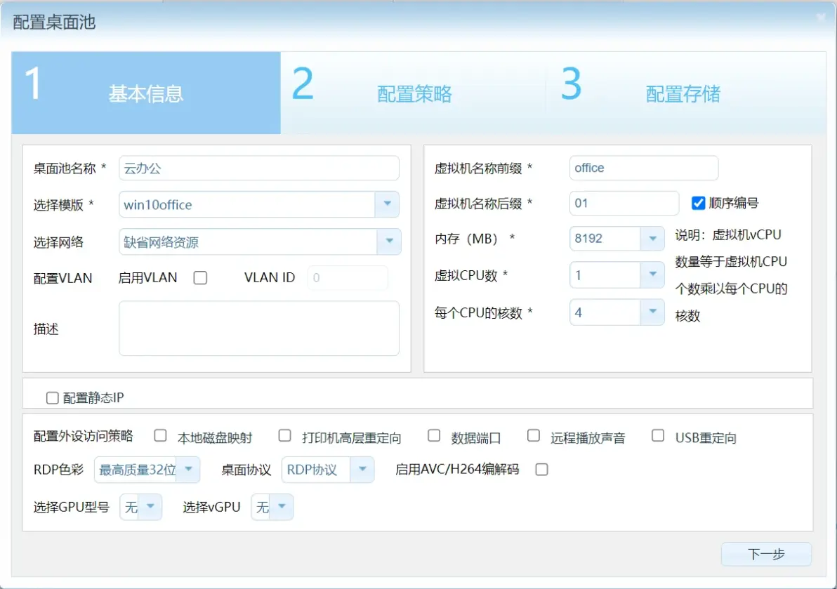根据项目规划,需要创建25个桌面,人均8G内存。接下来,我们选择 创建 桌面池。 内存设置为8G、处理器设置为1个处理器,4个核心。模板选择前一步创建好的 win10office 模板。 其他参数保持默认状态即可。