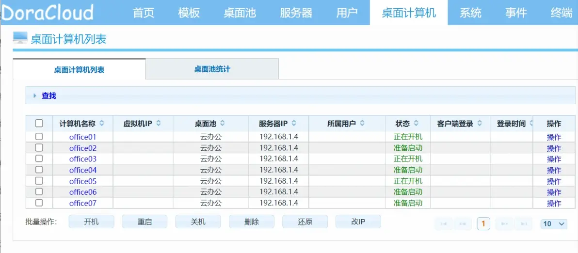 在桌面池创建后,可以从【桌面计算机】菜单中观察桌面计算机状态。可以看到DoraCloud系统已经开始创建虚拟桌面。