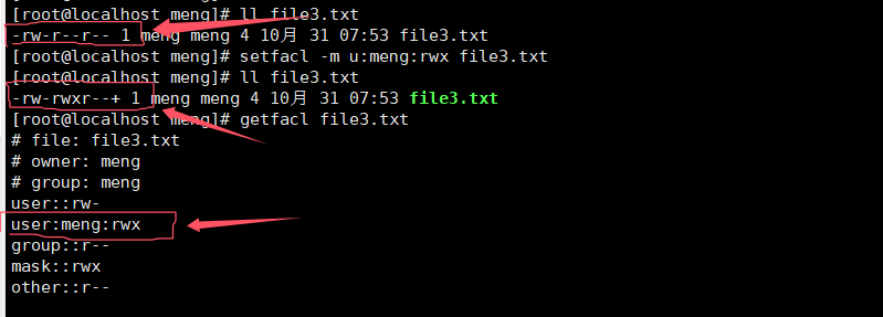 从上图可以看出使用setfacl后再ll,可以发现文件权限出现了一些小变化,多了一个加号,加号代表额外的ACL规则。而且从现有的发现来看,我们修改的是u权限,按理来说-rw-r--r--应该变成-rwxr--r--,但事实并非如此。原因是:ls -l 命令显示的基本权限位只反映了文件的基本权限,而不是ACL设置的权限。即使使用 setfacl 修改了某个用户的权限,基本权限位不会自动更新为反映ACL的变化。所以这个时候可以使用getfacl来查看这个文件的ACL规则。