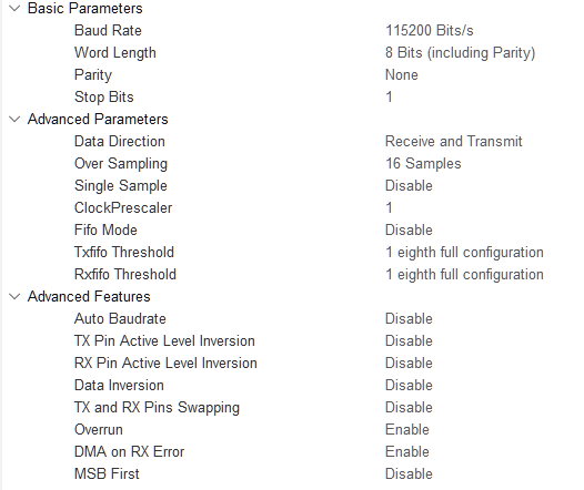 STM32方面代码使用CubuMx生成,串口基本参数为: