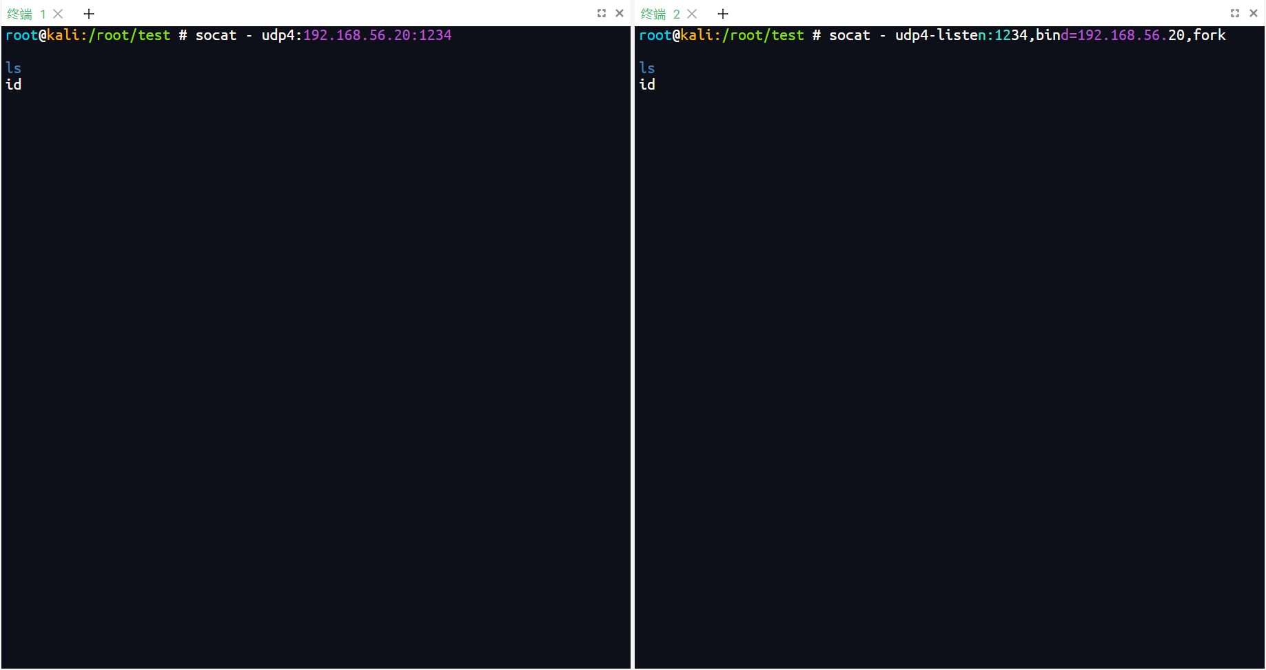 socat - udp4-listen:1234,bind=192.168.56.20,fork #STDIO UDP 服务端仅监听192.168.56.20接口的1234端口