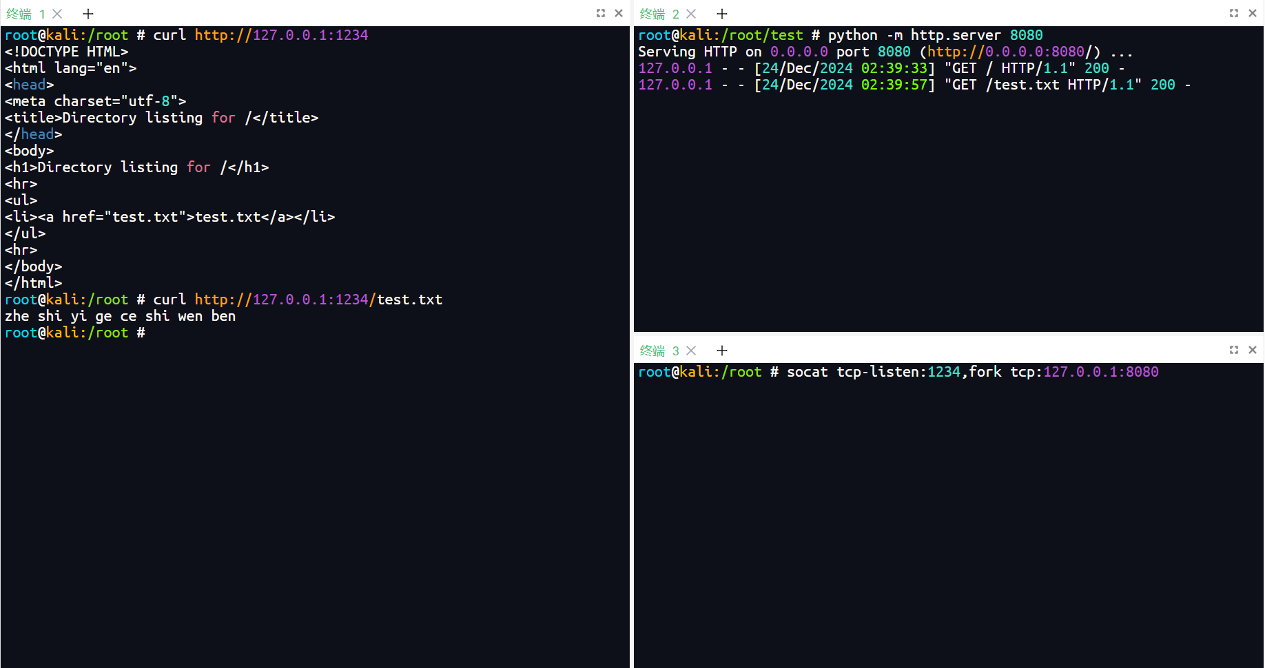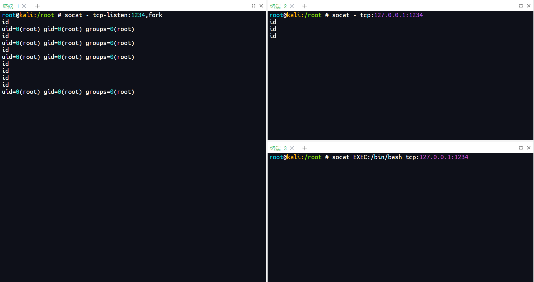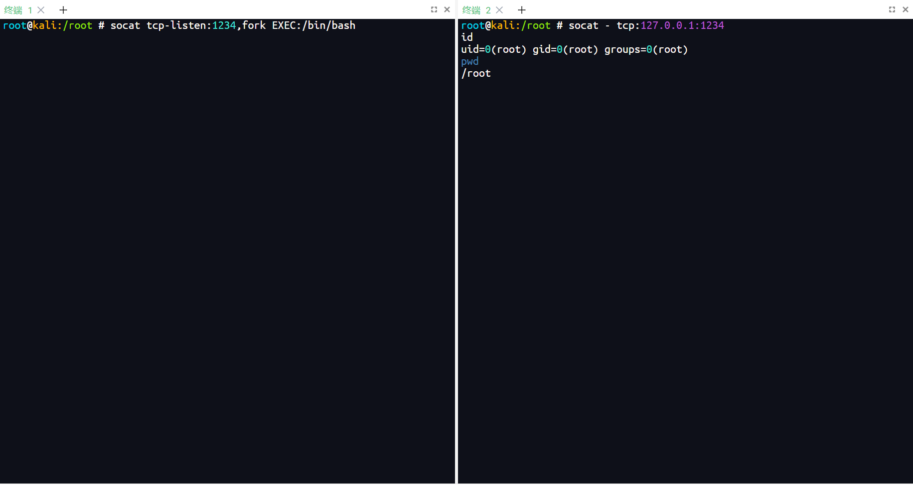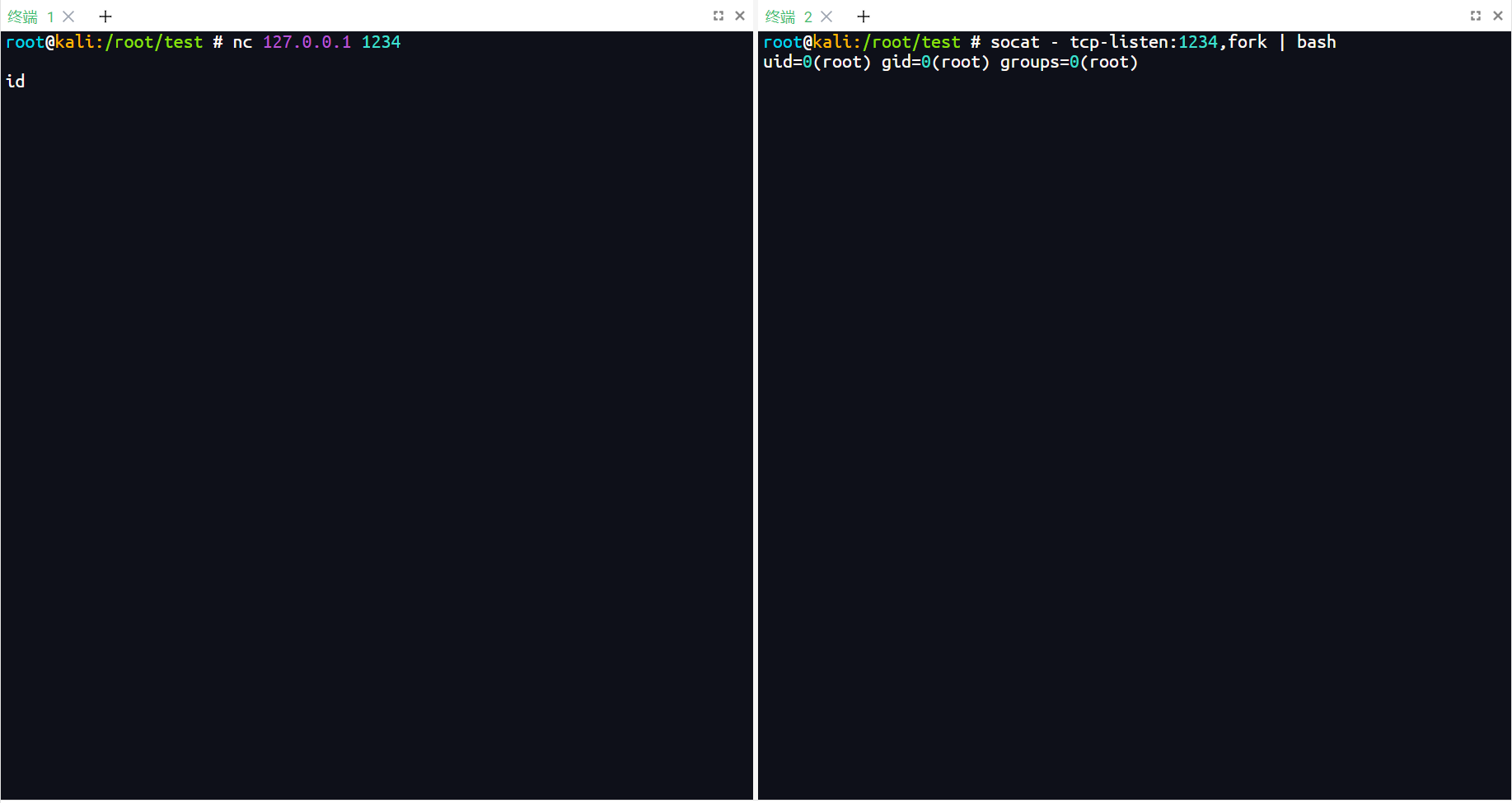 socat tcp-listen:1234,fork exec:/bin/bash #TCP EXEC 服务端监听1234端口