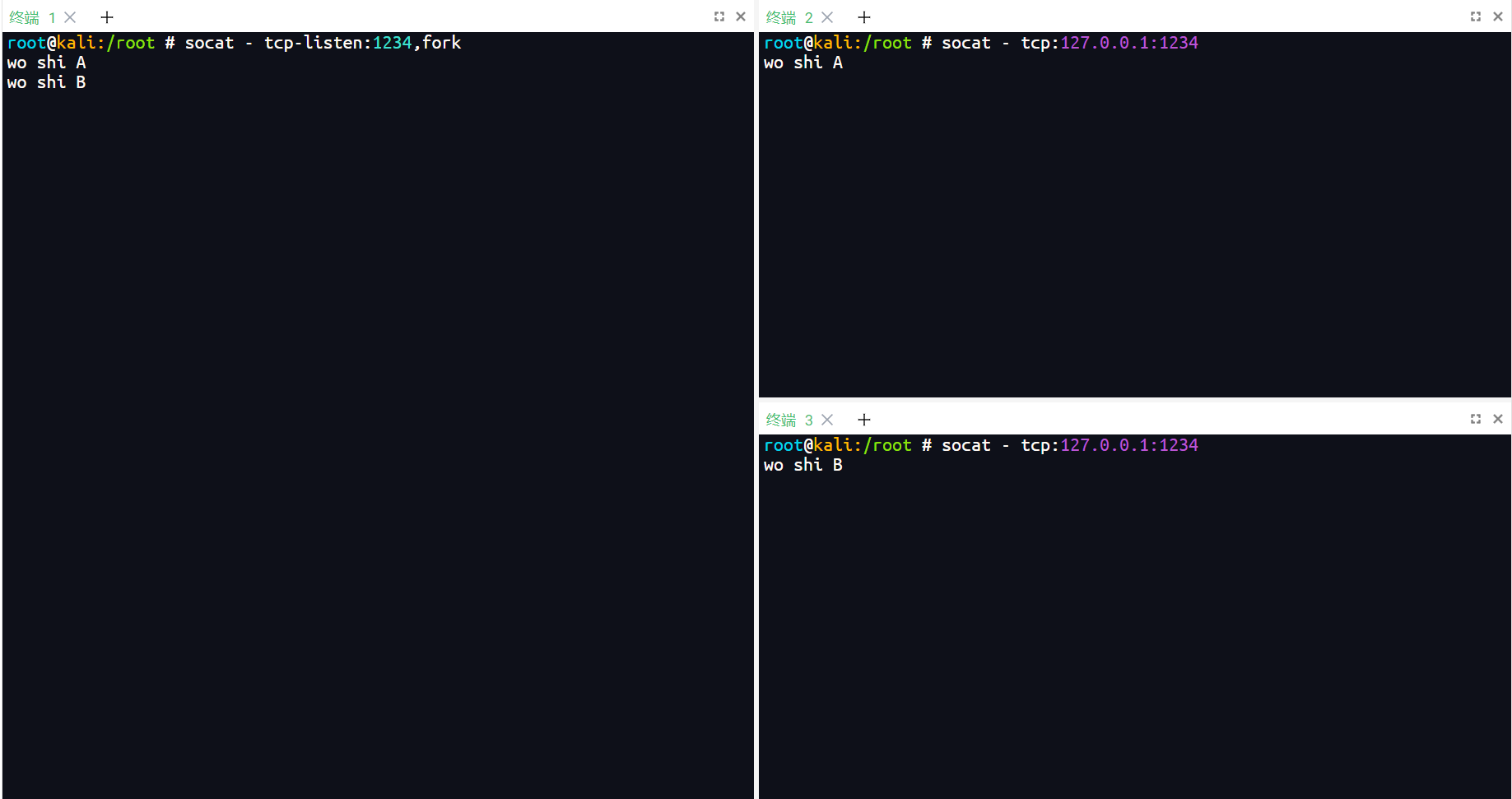 socat - tcp-listen:1234,fork #STDIO TCP 攻击机监听1234端口